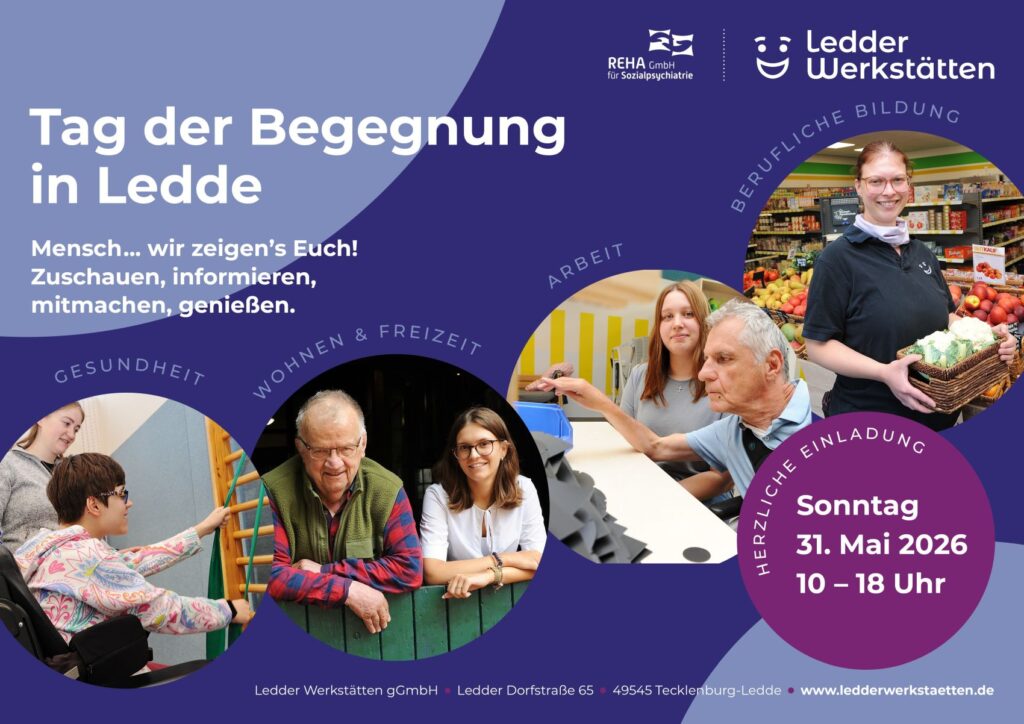 „Tag der Begegnung“ 2026: Am Sonntag, 31. Mai, laden wir Sie wieder in unsere Betriebsstätte Ledde ein. Erleben Sie unsere diakonische Einrichtung an der Ledder Dorfstraße 65 live. „Mensch, wir zeigen´s euch“ von 10 bis 18 Uhr: Unser Motto ist Programm des Tages. Sie erfahren aus erster Hand, welche Leistungen Menschen mit Behinderung täglich mit der richtigen Assistenz erbringen.